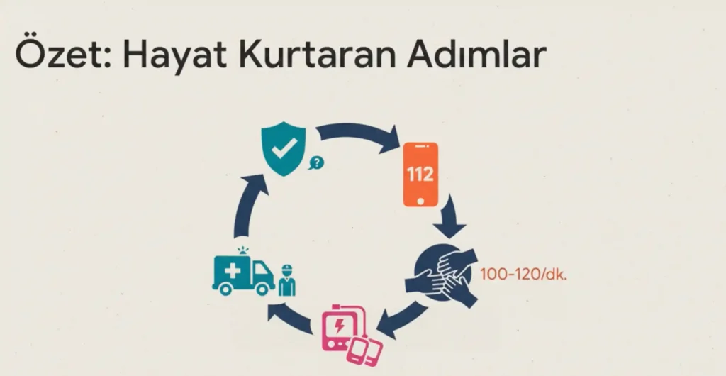 1. Güvenlik ve Çağrı: İlk yardımcı kendi ve hasta/yaralının güvenliğini sağlar. Hastanın omzuna dokunulur ve “İyi misiniz?” diye sorularak bilinç kontrol edilir. Bilinçsiz ise hemen 112 aranır veya aratılır.